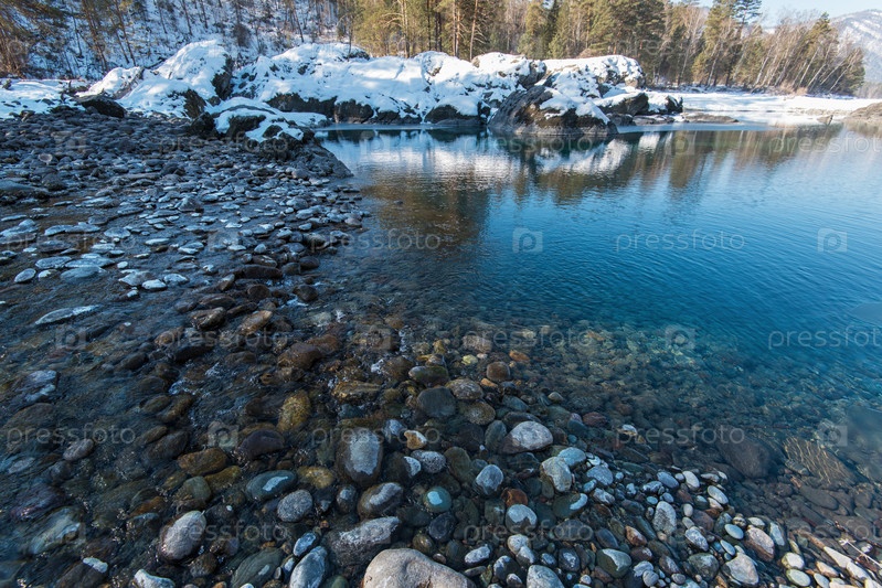 Кристально чистая вода голубого озера в горах Алтая