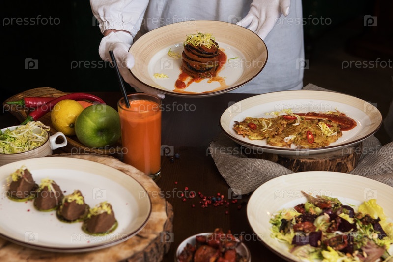 Официантка приносит здоровую вегетарианскую еду. Салат из свеклы с вялеными томатами и капустой, картофельные веганские блины, вяленые томаты, паштет из красной фасоли, запеченные овощи слоями, фрукты и морковный сок