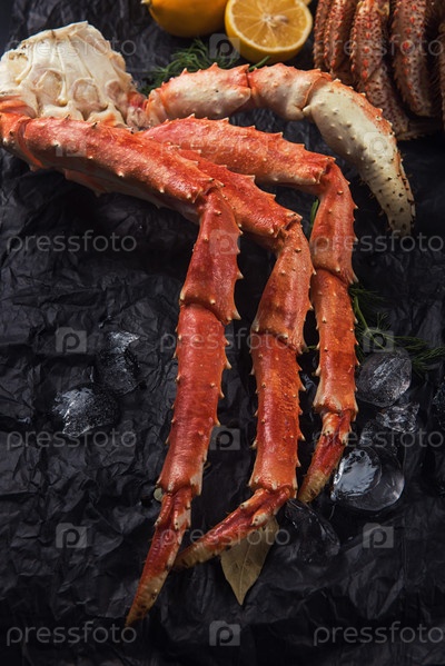 Набор морепродуктов: красная и черная икра, конечность волосатого краба, конечность краба-стригуна, дальневосточный камчатский краб