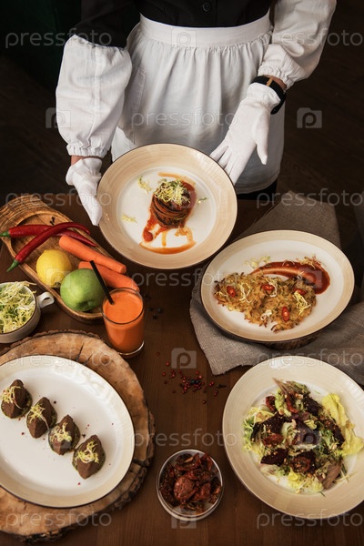 Официантка приносит здоровую вегетарианскую еду