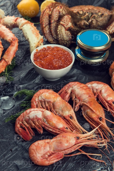 Набор морепродуктов: красная и черная икра, конечность волосатого краба, конечность краба-стригуна, дальневосточный камчатский краб