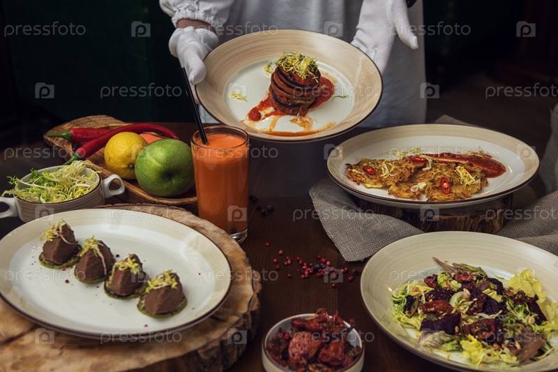 Официантка приносит здоровую вегетарианскую еду. Салат из свеклы с вялеными томатами и капустой, картофельные веганские блины, вяленые томаты, паштет из красной фасоли, запеченные овощи слоями, фрукты и морковный сок