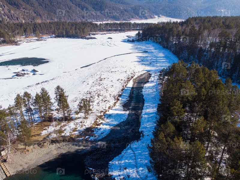 Вид с воздуха на зимние голубые озера в горах Алтая