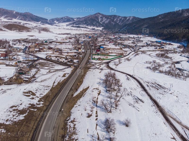 Вид с воздуха на дорогу в зимнем пейзаже Алтайских гор