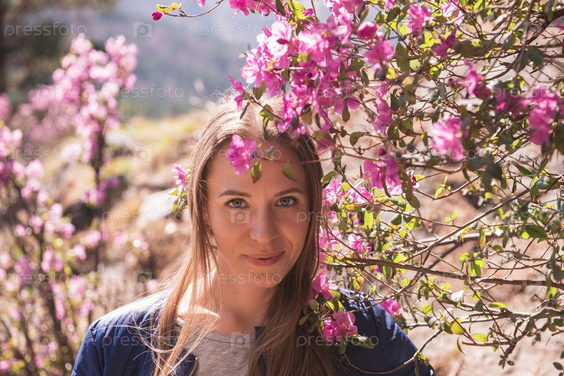 Портрет молодой красавицы в фиолетовых цветах рододендрона. Цветущий рододендрон - маральник в горном лесу Алтая весной