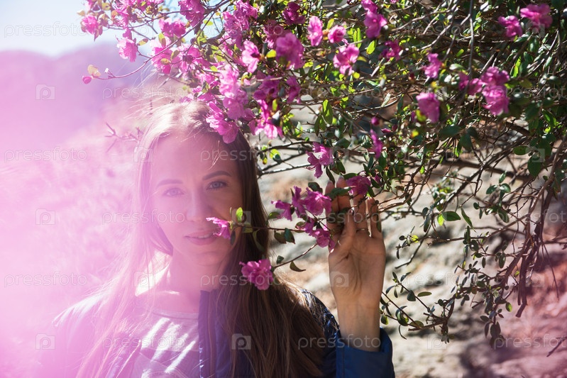 Портрет молодой красавицы в фиолетовых цветах рододендрона. Цветущий рододендрон - маральник в горном лесу Алтая весной