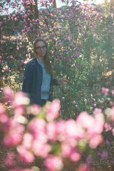 Портрет молодой красавицы в фиолетовых цветах рододендрона. Цветущий рододендрон - маральник в горном лесу Алтая весной