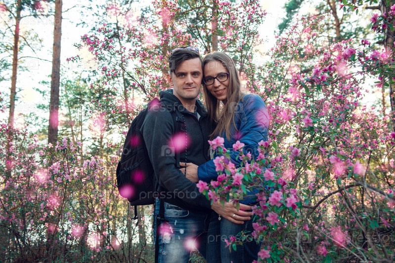Портрет молодой красавицы в фиолетовых цветах рододендрона. Цветущий рододендрон - маральник в горном лесу Алтая весной
