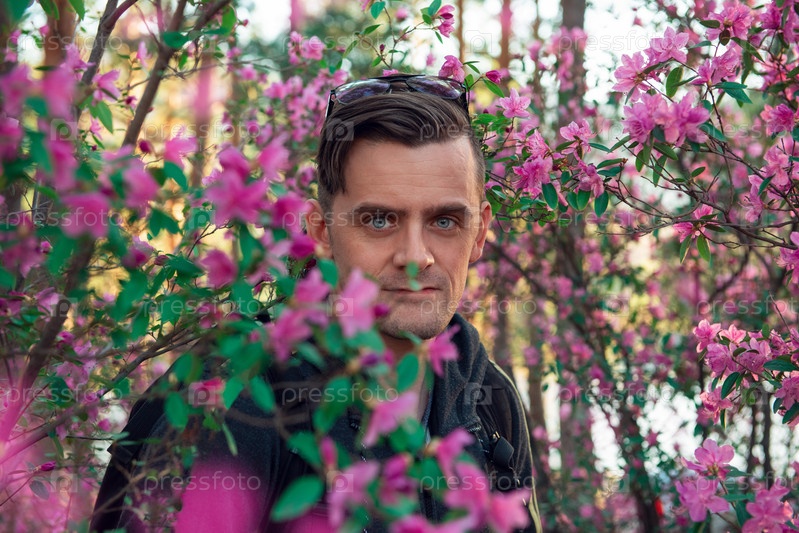 Портрет молодой красавицы в фиолетовых цветах рододендрона. Цветущий рододендрон - маральник в горном лесу Алтая весной