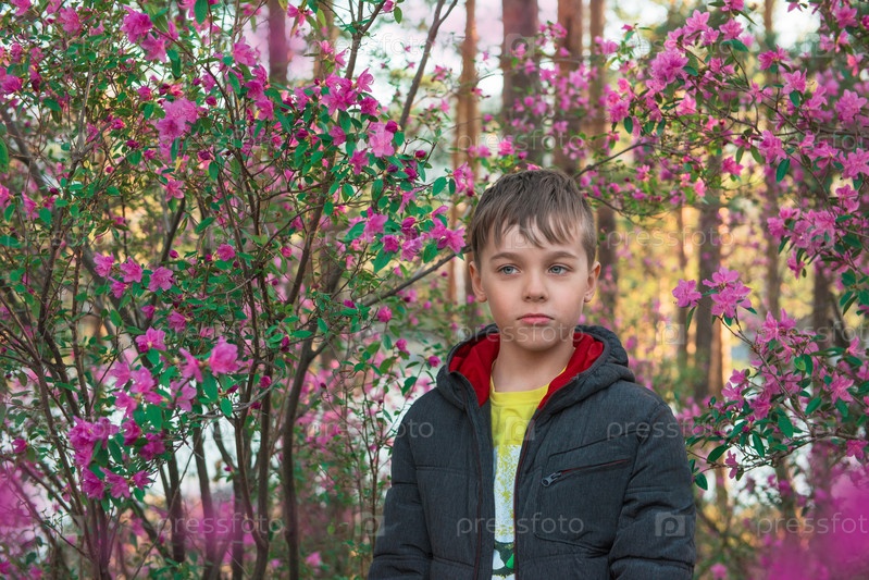 Портрет молодой красавицы в фиолетовых цветах рододендрона. Цветущий рододендрон - маральник в горном лесу Алтая весной