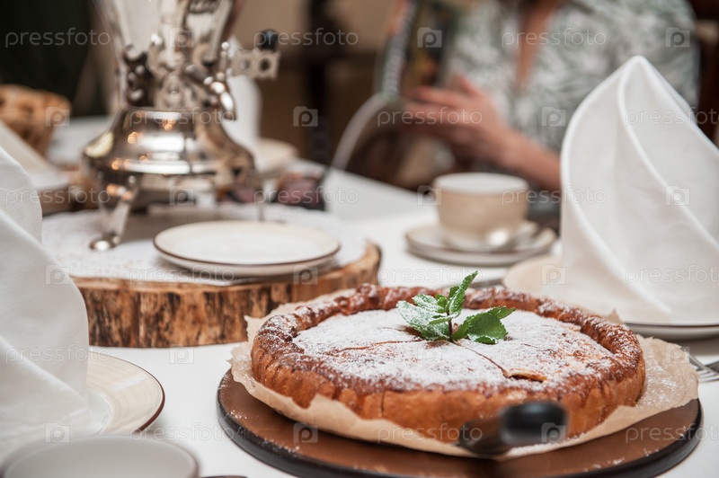 Яблочный пирог с самоваром на сервированном столе