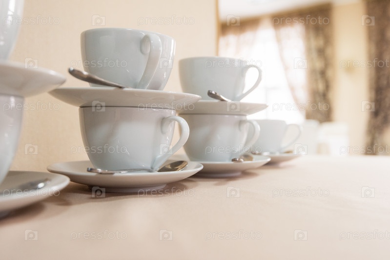 Много чашек на столе, концепция общественного питания, обслуживания банкетов или общественного питания