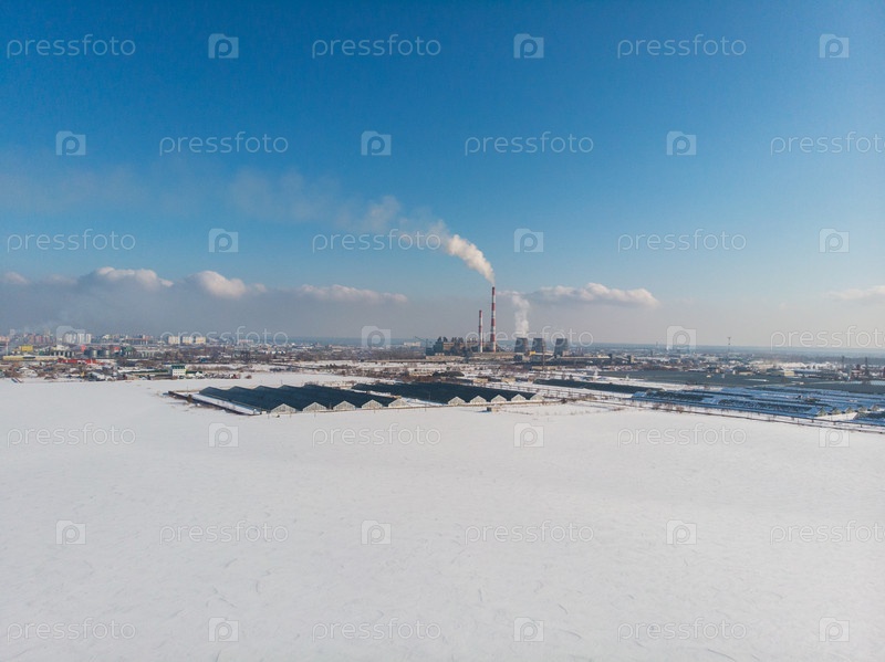 Пейзаж дымящихся труб заводов в промышленном городе, солнечная красота зимнего дня. Концепция опасной экологии в городе, дым и смог от заводов и фабрик