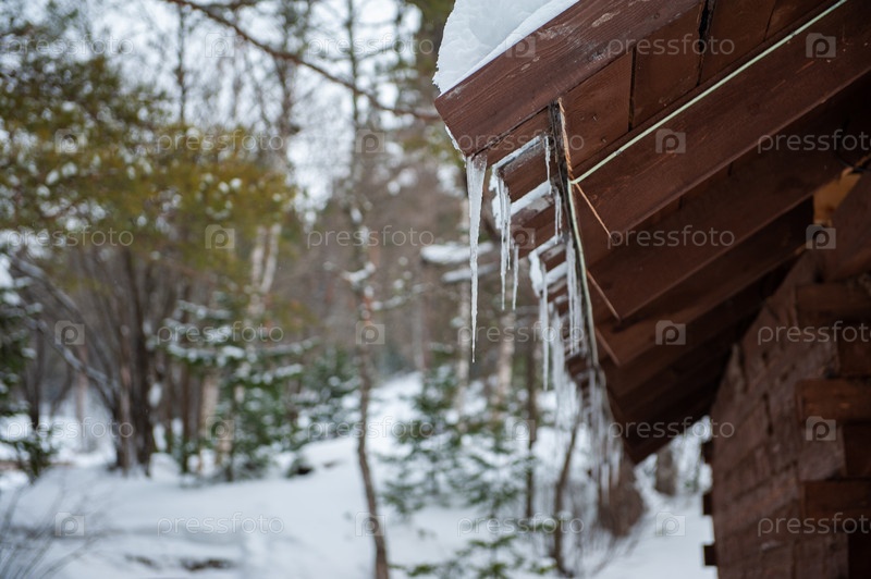 Фотография крупным планом сосулек, свисающих с крыши деревянного дома