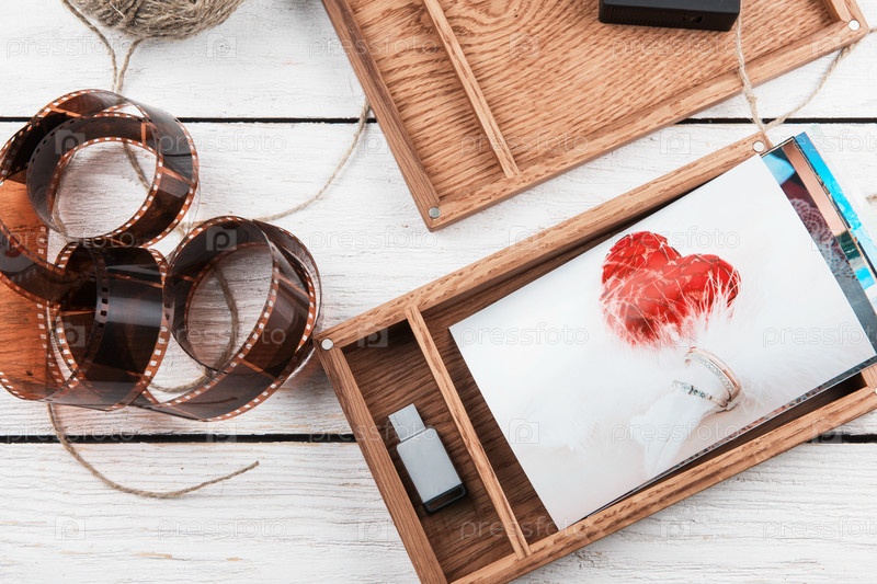 Деревянная фотокоробка со свадебной фотографией на День свадьбы. Романтическая любовь и концепция дня свадьбы