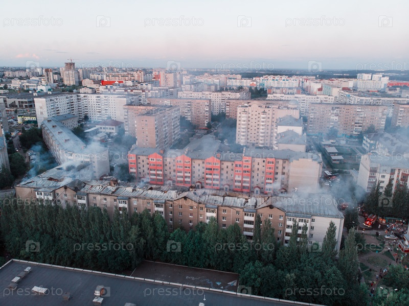 Аэрофотоснимки пожара, уничтожающего жилой дом в городском квартале