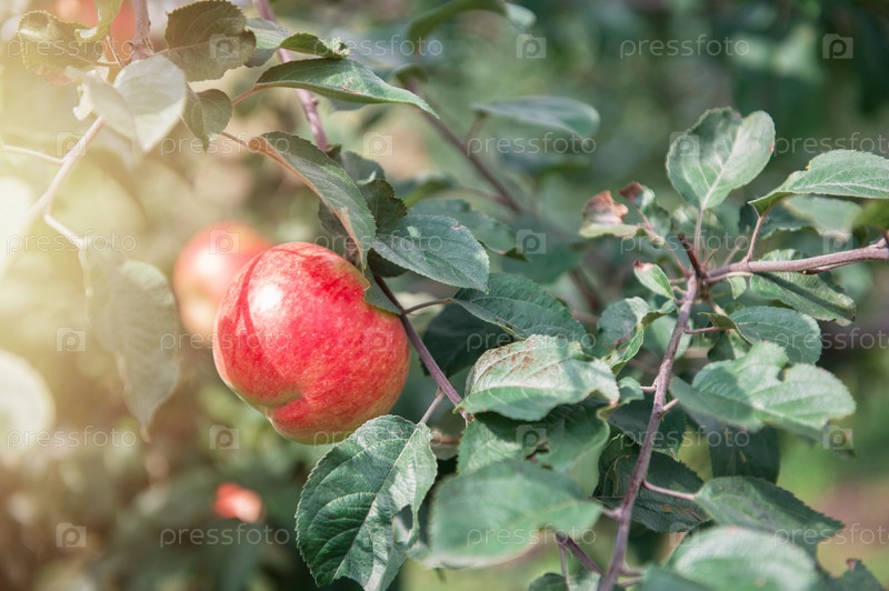 Яблоня с яблоками, органические натуральные фрукты в саду, концепция сбора урожая