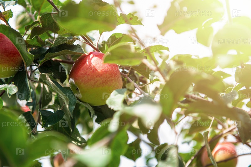 Яблоня с яблоками, органические натуральные фрукты в саду, концепция сбора урожая