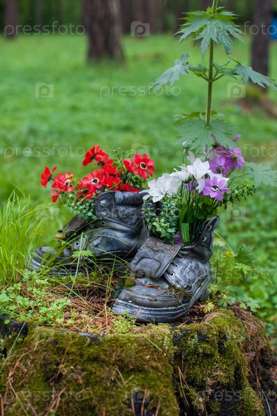 Туристический ботинок с цветами в лесу. Летний фон с забытыми ботинками и полевыми цветами. Концепция летнего сезона и путешествия