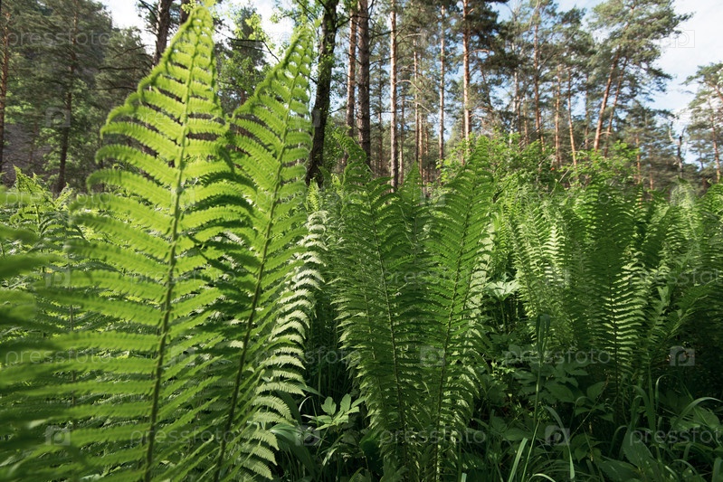 Зеленые папоротники в лесу солнечным летним вечером