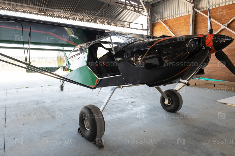 Маленький частный легкий винтовой самолет в ангаре, фотография крупным планом