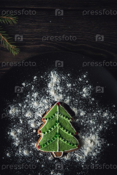Новогодние домашние пряники в виде елки на тарелке на темном деревянном фоне. Концепция новогоднего или рождественского праздника