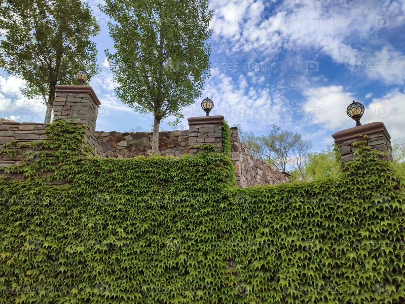 Каменная стена, покрытая плющом, с деревьями и фонарями