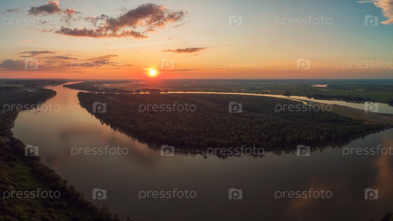 Вид с воздуха с беспилотника на речной пейзаж солнечным летним вечером