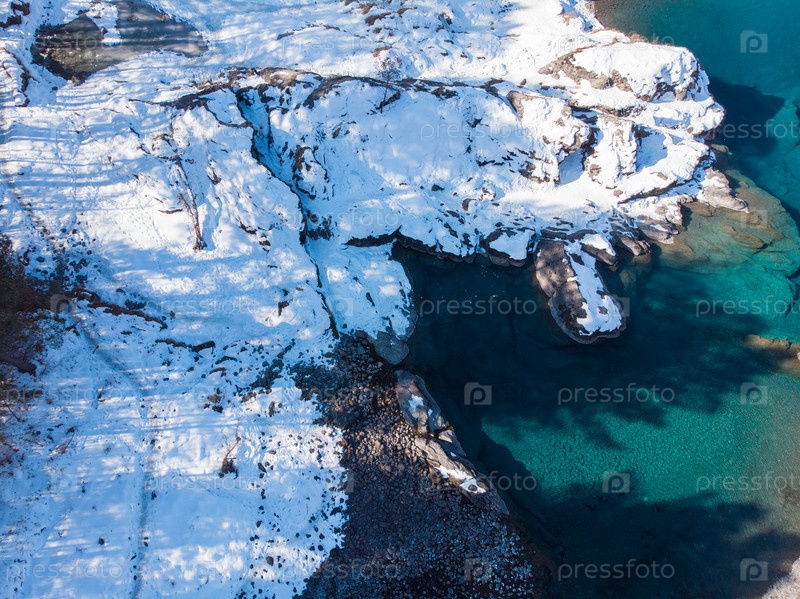 Вид с воздуха на зимние голубые озера в горах Алтая