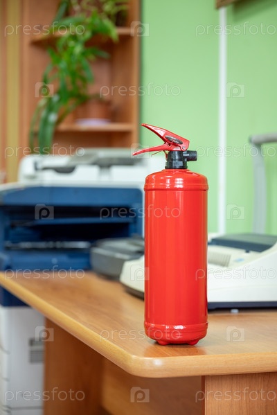 Огнетушитель в офисе на рабочем месте на нейтральном фоне