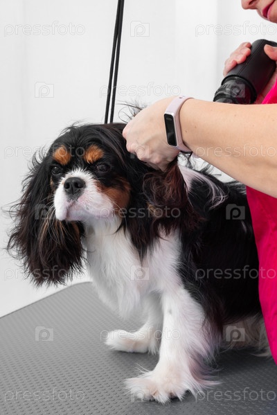 Профессиональный грумер для домашних животных использует фен для укладки шерсти собаки породы кавалер-кинг-чарльз-спаниель в салоне для животных. Концепция ухода за домашними животными и груминга. Изолировано на белом фоне