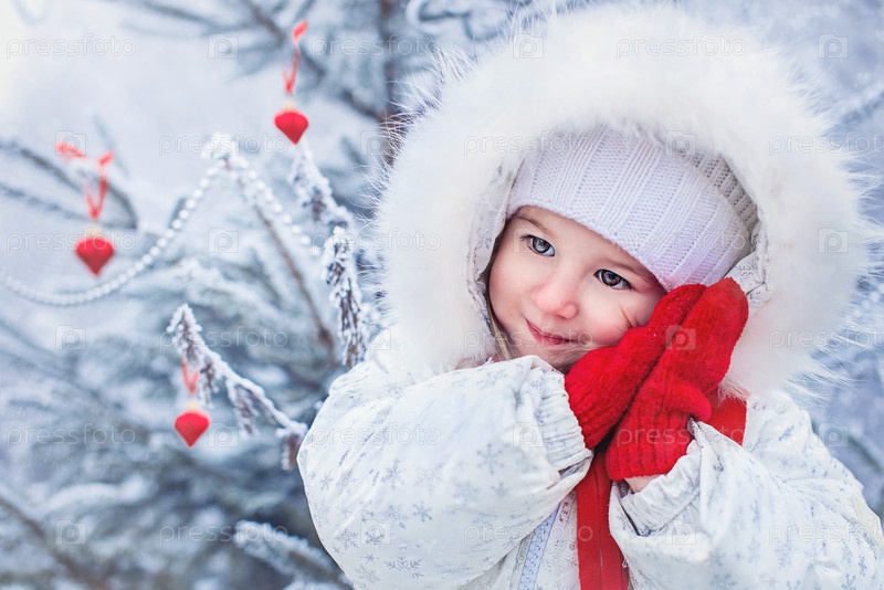 Новогоднее фото девочки в зимней одежде на фоне наряженной елки