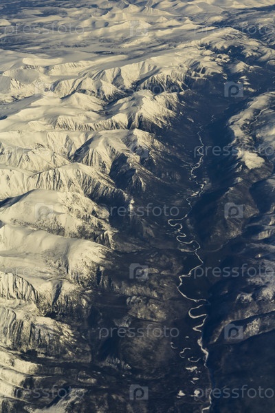 Россия. Восточная Сибирь. Вид из иллюминатора самолета на заснеженные вершины гор на высокогорном плато Иркутской области