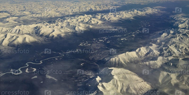 Россия. Восточная Сибирь. Вид из иллюминатора самолета на заснеженные вершины гор на высокогорном плато Иркутской области