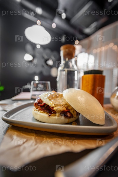 Маленький Бао вкусный цыпленочный бургер крупным планом. Лучший азиатский бургер. Не вегетарианский