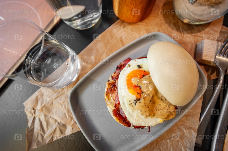 Маленький Бао вкусный цыпленочный бургер крупным планом. Лучший азиатский бургер. Не вегетарианский