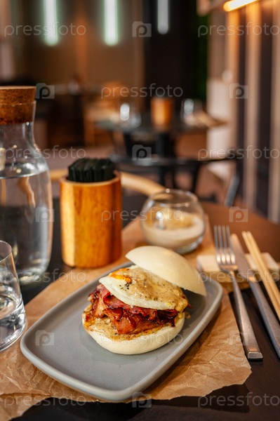 Маленький Бао вкусный цыпленочный бургер крупным планом. Лучший азиатский бургер. Не вегетарианский