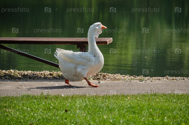 Гусь идет по тропинке у озера на фоне зеленой растительности, отражающейся в воде. Лето