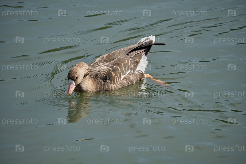 Крупный план гуся, плывущего по спокойной поверхности озера. Естественная дикая природа, коричневый пятнистый окрас и естественная красота водоплавающих птиц в их естественной среде обитания