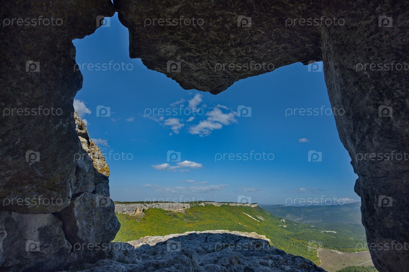 Вид изнутри полуразрушенного каменного помещения знаменитого пещерного города Мангуп-Кале V века в Бахчисарайском районе