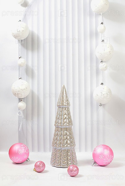 Рождественская композиция с фарфоровой елкой и праздничными игрушками на элегантном фоне. Рождественский и новогодний эко-макет для дизайна и демонстрации продукции, концепция кануна Рождества