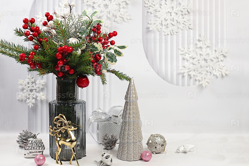 Рождественский креативный букет из живых еловых веток в вазе с цветами хризантемы и украшениями ручной работы на элегантном праздничном фоне. Рождественский и новогодний эко-макет для дизайна и демонстрации продукции, концепция кануна Рождества,
