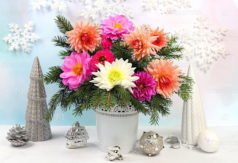 Рождественский креативный букет из живых еловых веток в вазе с цветами хризантемы и украшениями ручной работы на элегантном праздничном фоне. Рождественский и новогодний эко-макет для дизайна и демонстрации продукции, концепция кануна Рождества