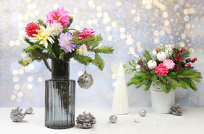 Рождественский креативный букет из живых еловых веток в вазе с цветами хризантем и самодельными украшениями на элегантном праздничном фоне. Рождественский и новогодний эко-макет для дизайна и демонстрации продукции, концепция кануна Рождества,