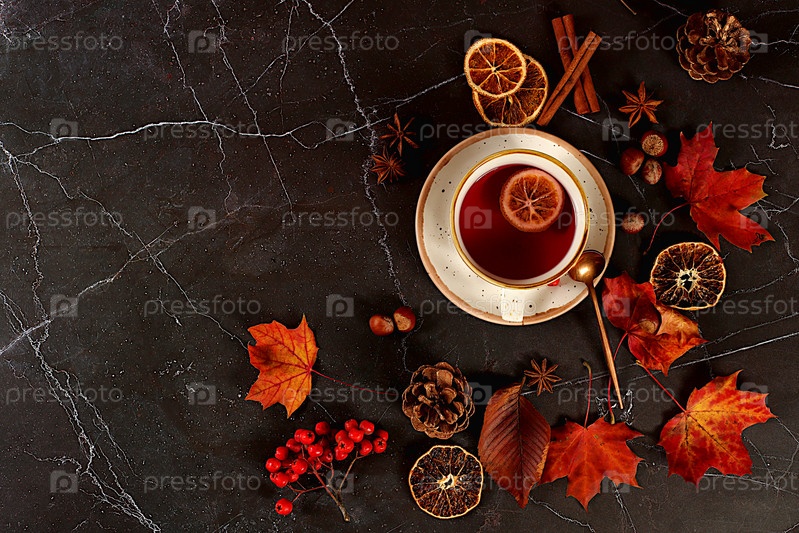 Осенняя абстрактная композиция с горячим глинтвейном, кленовыми листьями, сосновыми шишками, орехами, корицей, бадьяном и ягодами рябины, натюрморт, концепция Дня благодарения, сезонный фон, баннер или заставка, поздравительная открытка или приглашение,