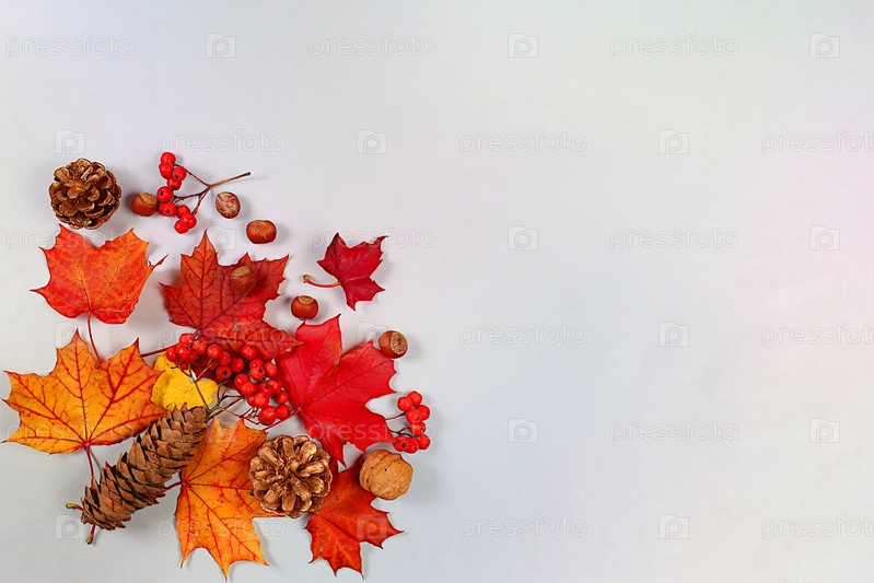 Осенняя абстрактная композиция с кленовыми листьями, шишками, орехами, корицей, бадьяном и ягодами рябины, натюрморт, концепция Дня благодарения, сезонный фон, баннер или заставка, поздравительная открытка или приглашение,