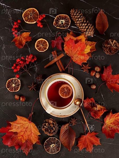 Осенняя абстрактная композиция с горячим глинтвейном, кленовыми листьями, сосновыми шишками, орехами, корицей, бадьяном и ягодами рябины, натюрморт, концепция Дня благодарения, сезонный фон, баннер или заставка, поздравительная открытка или приглашение,