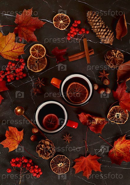Две цветные эмалевые кружки с горячим осенним напитком, глинтвейном и осенними опавшими листьями, звездчатым анисом, сосновыми шишками, рябиной и корицей на мраморном столе, баннер, концепция осеннего приветствия,
