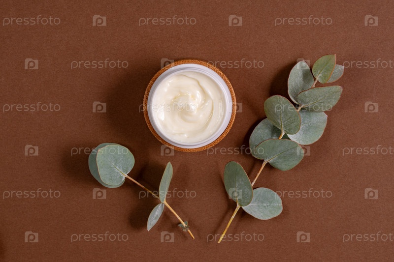 Вид сверху на бамбуковую банку с кремом для лица на коричневом фоне. Украшение из сухих листьев эвкалипта. Профессиональный флакон для ухода за лицом и телом. Небрендированная упаковка