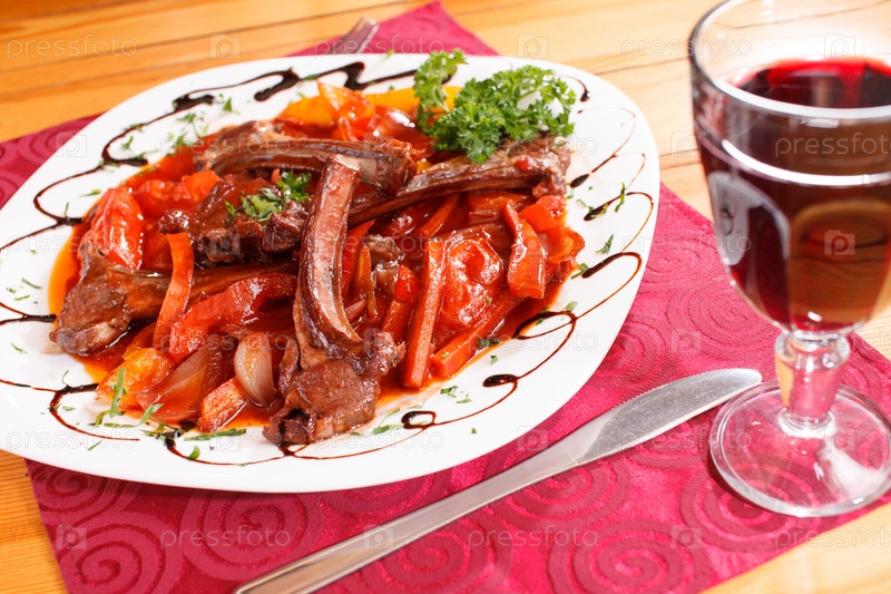 Ребра с овощами и бокал вина